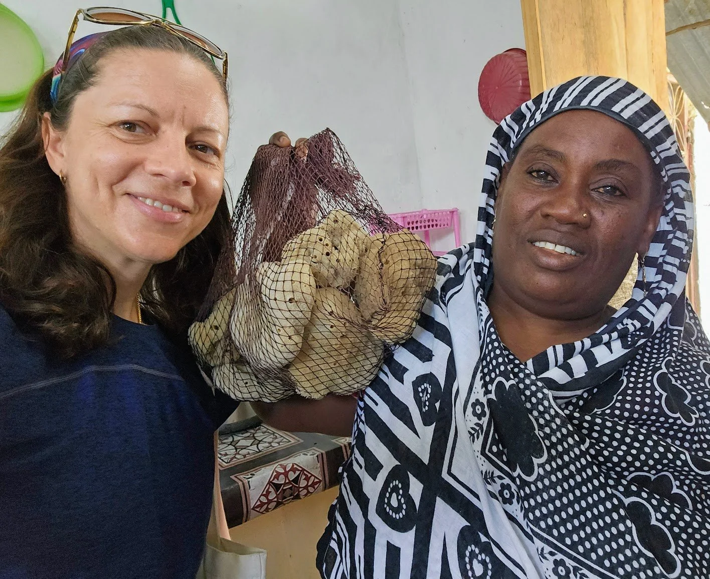 We arrived at Nasir’s home, and she welcomed me with a hug. We sat on the floor of her living room, and Okala translated as I asked her a series of questions about her work. In caring for the sponges, she freedives (a Zanzibari haenyeo!) and spends about 3-4 hours a day in the water during low tide. Sponges are harvested from September through December, and the bulk of them are sold to tourist shops in the spring. She said that she feels a strong sense of camaraderie from the other sponge farming women in the community who form a co-op called Wakulima Wa Sponge Co-op. As a single mother of four children, Nasir is quite busy, as are her peers, and they depend on each other’s support. The biggest challenge in her work, she says, is climate change. She can tell that over the past 10 years alone, the sponges are suffering from bacterial infections that are only possible because of changing water temperatures. This has directly impacted how many sponges are harvested in a given season.