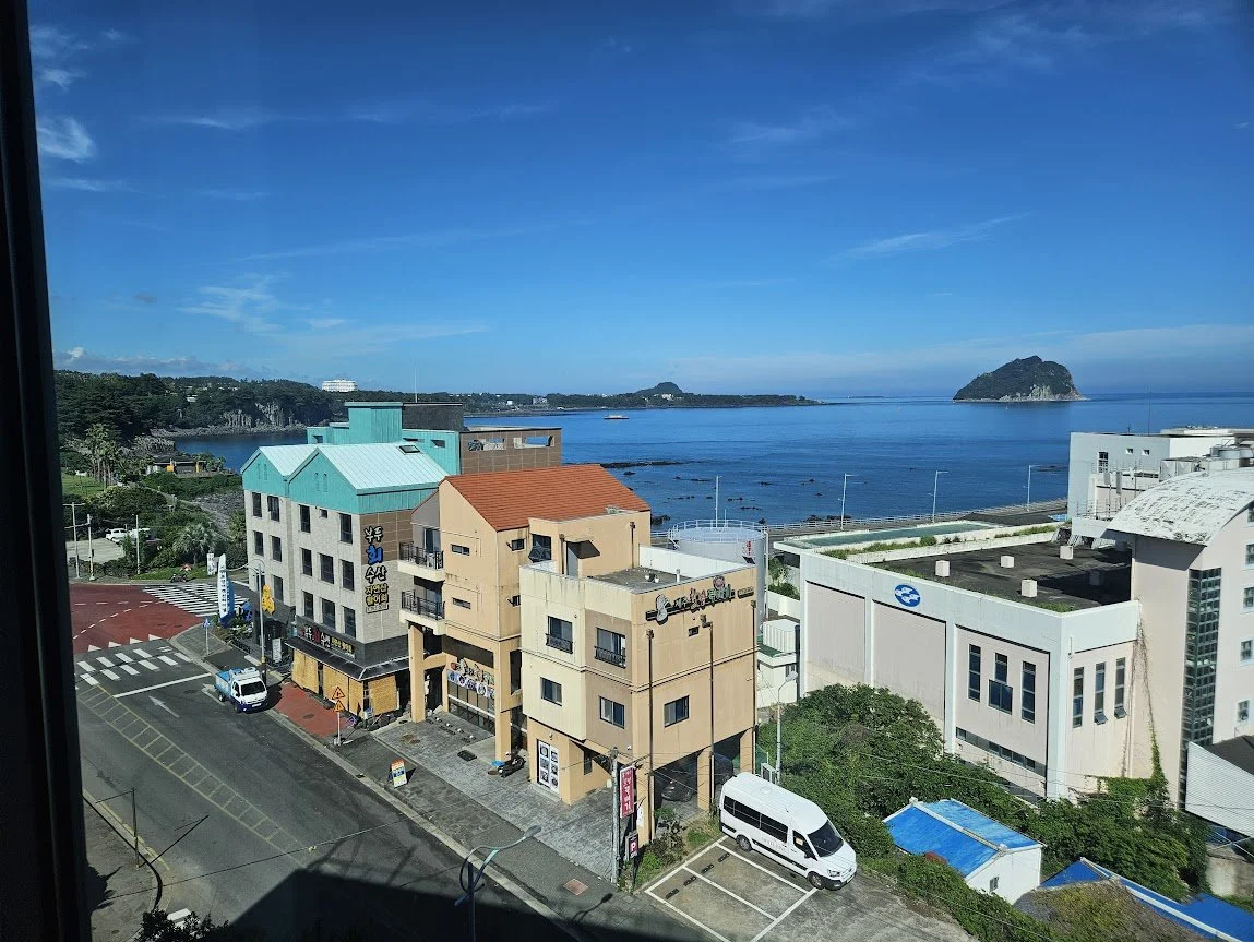I am finally writing from Jeju Island, South Korea! After a lot of flying and a layover in Beijing (why not Seoul, you ask? Airlines are weird and it was somehow faster and less complicated this way), I arrived on June 30th in the afternoon. I am staying in the city of Seogwipo, on the southern and opposite side of the island from the airport. It is the second largest city on Jeju, and much larger in population than I had imaged from my research. This is definitely the busy tourist season for Jeju; it is considered “the Hawaii of Asia”, at least to the Chinese, Koreans, and Japanese, as a vacation spot. I can certainly see why: palm trees, beaches, unique rock formations, unique museums (like Hello Kitty and Action Figures and Seashells), and lots of resorts. My room with a view certainly can’t be beat.